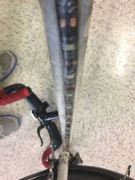Tira del LED: una vez que estés feliz con la colocación de la tira, saca tu cinta y asegure la luz de su marco. Fuimos longitudinalmente junto con mi cuerpo y tenía unas tiras de envoltura alrededor de mi cuerpo al inicio y al final de la luz. Agregué unas tiras de cinta adhesiva alrededor de mi eje pedalier como preventivo extra fuerte. Montar mi bicicleta todos los días a través de las 4 estaciones canadienses, así que espero la cinta transparente al tiempo de decaimiento. Estoy esperando que la cinta mantendrá los puntos cruciales juntos por más tiempo. Me aseguré de que la cinta va entre los LEDs!!