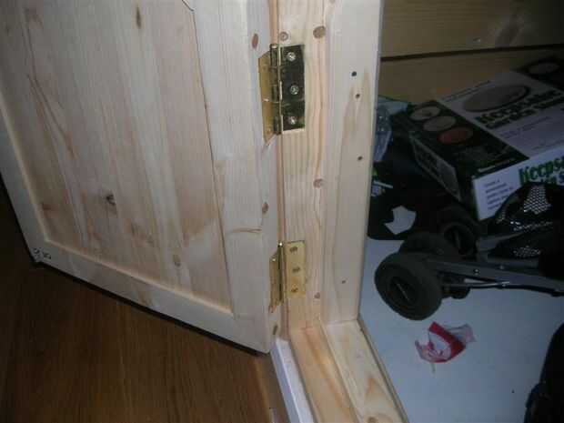 Después de las bisagras y las puertas están aseguradas en su lugar cerca de una puerta y marcar donde quieres que el tapón de la puerta de uñas tanto de las puertas todo el interior para marco. El tapón puede ser redondeado o biselado en los bordes y actúa como un propósito decorativo y evitará saltar. Después de que el tapón esté en su lugar Conecte su sistema de fijación. He utilizado fijación abrazaderas son baratos pero excelente para este tipo de puertas.