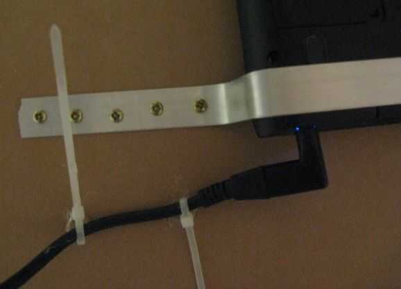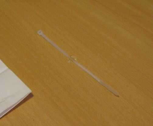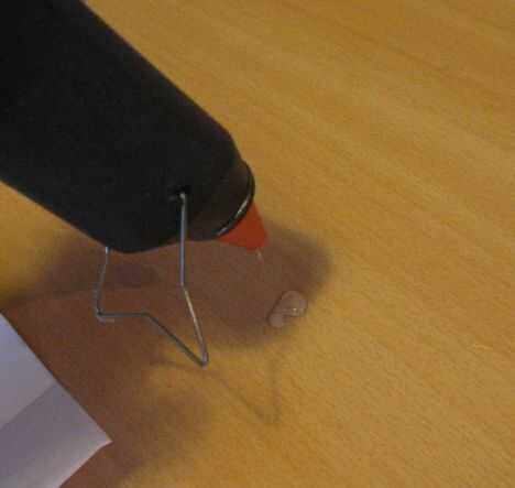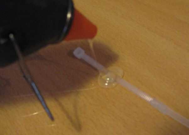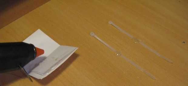 Ahora encienda la pistola encoladora y una vez que esté bien caliente, verter un primer gob de pegamento. ¿Hacer? Ahora antes de que el pegamento se refresca abajo y conjuntos, pulse una amarra en la parte superior y levemente en - y finalmente, una última gota de pegamento sobre la brida de plástico para sellar. Voila! Ahora usted puede poner su escritorio hacia arriba.