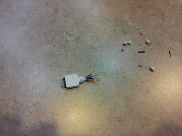 El cable del intercomunicador funciona muy bien como el extremo macho y no hay que salvar en el conector. El alambre sólido empuja muy firmemente en el extremo hembra de la tira de la luz. (Esto es donde puede Agregar pegamento caliente sólo para asegurarse)