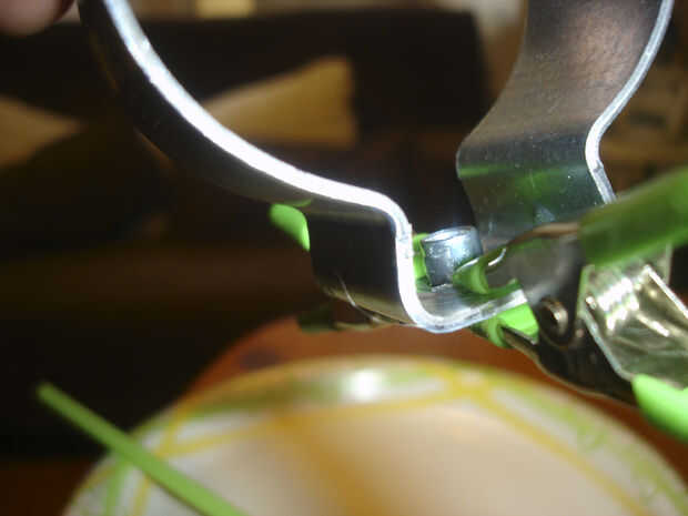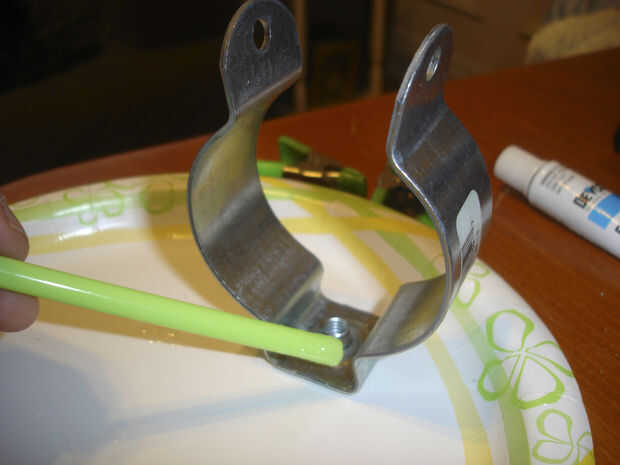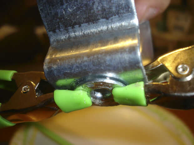 Aplicar el epoxi alrededor del agujero en la parte inferior de la suspensión del conducto y a lo largo de la superficie de la tuerca de T. Espere 15 minutos. He utilizado mini vice grips para mantener una presión constante hasta que se asegure. Otro pequeños lotes de epoxi de la mezcla y aplicar en la parte superior del perno. Este epoxi necesita 1 hora para curar.