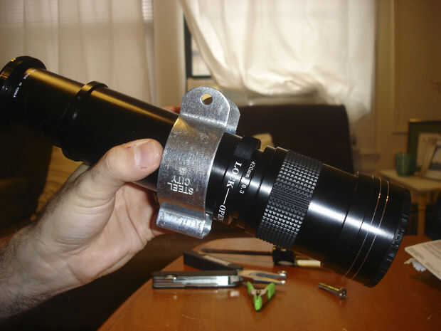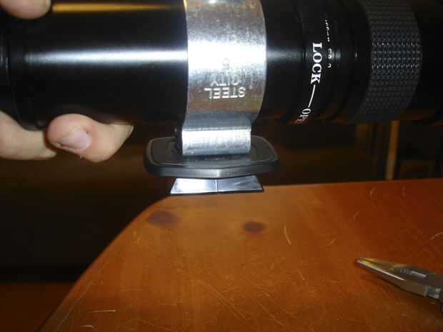 Retire el tornillo que viene con el soporte del conducto. Abra levemente para caber alrededor del cuerpo de la lente. Una vez alrededor del cuerpo apretar el tornillo y el perno hasta que queden bien. Usted puede hacer esto con su cámara para asegurarse de que la base está en la parte inferior.