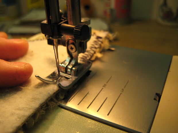 Por último, coser alrededor de los bordes para evitar que se deshilache. Utilizar una puntada zig-zag amplio (aprox. 5mm de ancho) con una separación de puntada de approx.2mm, dejando a un lado de la puntada Envuelva alrededor del borde de la alfombra. Ate los extremos del hilo de rosca firmemente en el lado de la pila de la alfombra.
