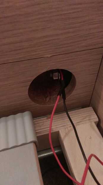 Usé el taladro hacer un agujero para los cables de pasar. Lo bueno de esta cama de Ikea es que ya hay un agujero para colocar el lado de la cabecera. Usé esto para perforar el agujero. Tuve que cometer para perforar a través de la cama. Yo podría simplemente pasaron los cables por debajo. Sólo pareció un final limpio.
