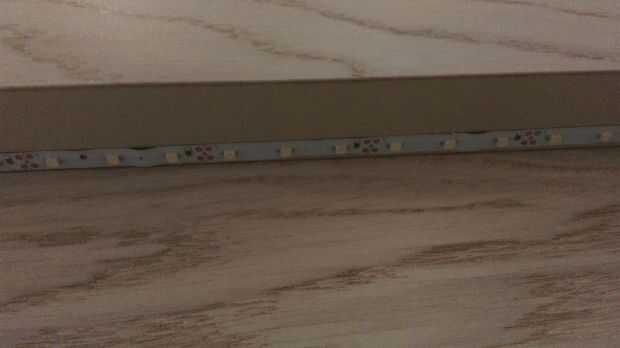 Lo siguiente que necesita hacer es agarra la cinta métrica y medir el espacio en el que irá a las tiras de LED. Una vez que esta medida pueda tropezar las tiras a medida. Las tiras de LED que utilicé tenían cinta de doble cara, que es un dolor para tratar de sacar el papel superior. Decidí que engancharía tan cerca de la parte posterior del labio como sea posible. Esto fue principalmente limitar la posibilidad de ver las tiras.