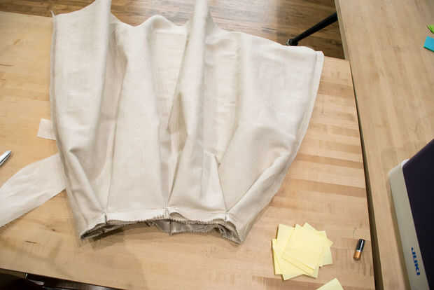 6. Prender los pliegues juntos y coser 3/4" abajo de la cintura (puntada a través de la SA). Hierro abrir sólo las costuras nuevas.