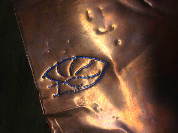 Era la fuente de cobre más cable ROMEX que tenía en el garaje. He pelado el cable hacia abajo para el cobre pelado (madre) y luego marcó algunas hojas con un bolígrafo en el parpadeo. Esto proporcionó las líneas de corte, así como las venas de la hoja. Si usted dobla la parte inferior de la hoja alrededor del tallo, le da un lugar perfecto para la soldadura a la madre.