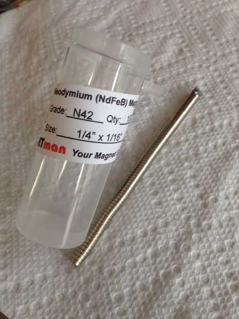 -Imanes neodimio. Usé 1/4 x 1/16. Los obtuve de aquí. Tenía una marca diferente antes de una nave de almacén y algunos de ellos agrietado. Ni un solo uno de ellos roto.
