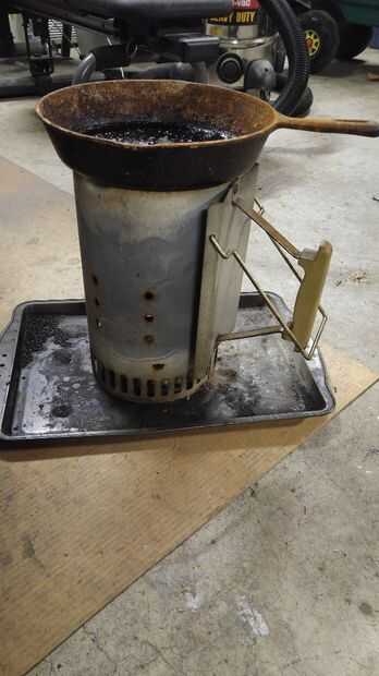 Mi carbón de leña y madera será en un encendedor para chimenea de carbón. Im usando un viejo horno pan para coger mi ceniza y una sartén de hierro fundido con agua para descansar en la parte superior del encendedor para chimenea de agregar humedad y mantener el calor directo de lo que estoy fumando. En el futuro, podría construir una cesta de carbón más grande pero por ahora a trabajar.