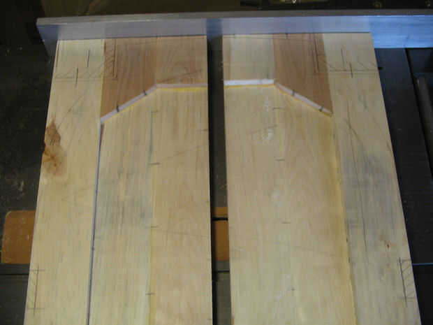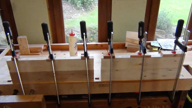 Para formar el asiento, utilizar los portadores de una gruesa capa de base y tramos de listón para 'reforzar' la parte superior de los lados, parte trasera y zona del pomo. Que te gustaría usar tacos o galletas para ayudar a alinear los portadores. Sólo mantenga luego en la mitad inferior del espesor, para permitir el asiento que se formó y evite las áreas que serán visibles cuando se corta el contorno del asiento. En esta etapa, hago el asiento en dos mitades, ya que es más fácil de manejar, pegar las mitades más adelante.