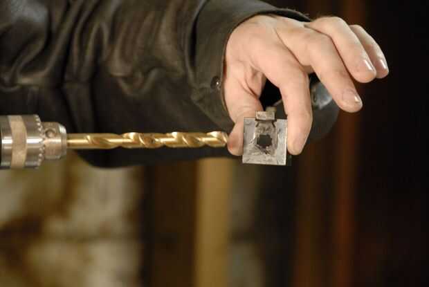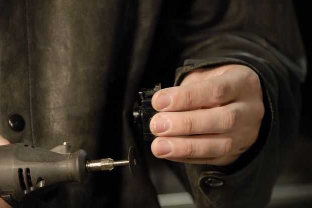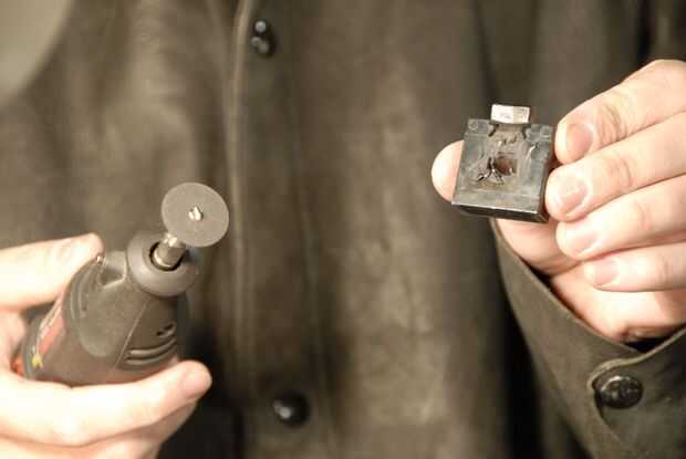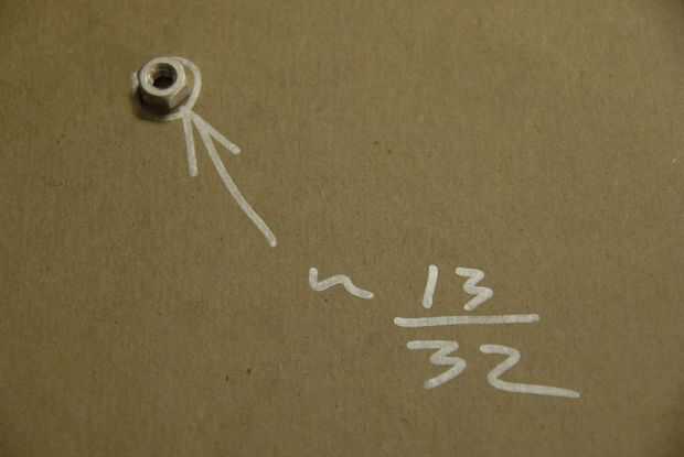 Ahora tenemos que crear un espacio para el perno de montaje del trípode en el vieja pista de montaje para la luz. Usé una dremel con un disco de corte para cortar el Monte al ras en la tapa. Una vez más, recordar a la pieza de trabajo durante el uso de herramientas eléctricas. A continuación medir el OD de 1/4"- 20 tuerca lo adquirido anteriormente. Mina fue aproximadamente 13/32". Perfore un agujero de 13/32" a través de la tapa que se corta al ras antes. Esto se utilizará más adelante.