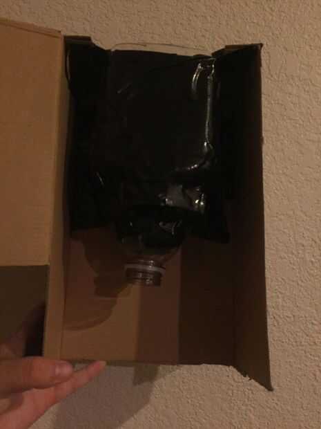 Cinta la jarra en su lugar en la caja de zapatos con la parte inferior del tarro en el hoyo en la caja de zapatos
