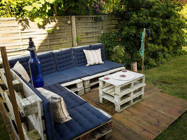 Queríamos crear una segunda terraza en el patio trasero de nuestra casa. Sin embargo, puesto que vivimos en los alojamientos la solución debe ser rentable. Tenemos busqué en Google un poco y encontré varias ideas con palets. Eran muy afortunados y ha comprado 25 paletas (10 EURO-palets y otros 15) de 30 euros en eBay. El EURO-palets proporcionan la base para el Banco de la esquina. Las otras paletas estaban cerradas (sin espacios entre las barras) y por lo tanto ideal para el piso de la terraza.
