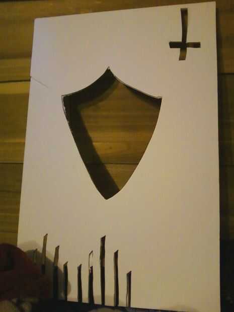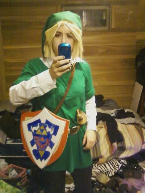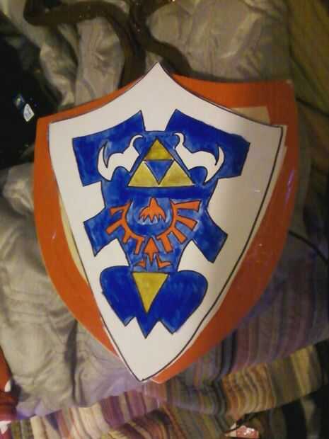 Para el escudo, usé mi cuchillo x-acto a tallar en el tablero de la espuma. Una sola pieza de tablero de la espuma es mucho, como veis en la foto, he usado la misma pieza para varios otros trajes. Una vez que tiene la forma deseada, yo que se refiere a una imagen del escudo de Link en Google imágenes y había pintado el diseño en. Originalmente tenía adjuntas que asas de cinta, pero más tarde encontró un escudo de tienda de segunda mano con un mango mejor y solo graba mi escudo en la parte superior.