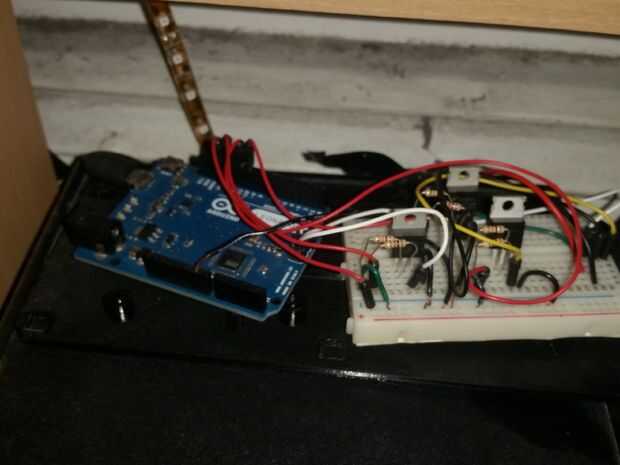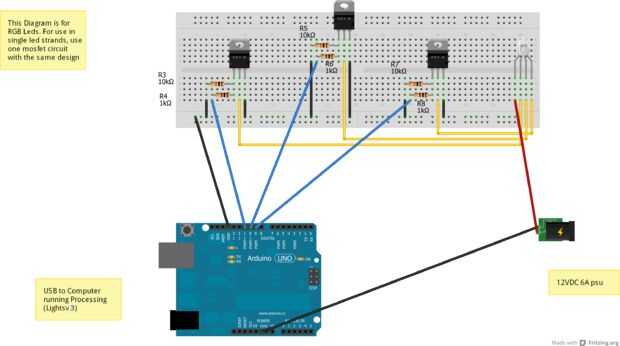 Asegúrese de que el cable correcto de arduino están conectados a los pines adecuados sobre el mosfet. La orientación debe ser la misma que en los diagramas, use los cuadros son guías. También sean las resistencias de 1K y 10K en las ubicaciones correctas, ya que esto hará que las luces demasiado tenue.