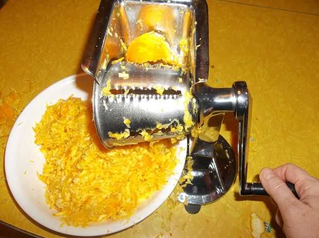 Para rallar o rebanar, utilizar una trituradora de cono manual de alta calidad, pero un procesador de alimentos o una mandolina, todo funcionará, aunque el procesador cono trituradora/máquina de cortar y los alimentos son la manera más rápida, más fácil de procesar tantas naranjas a la vez.