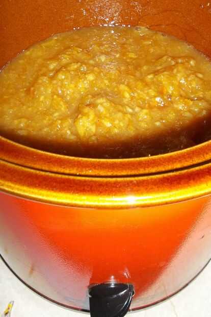 Cocinar en el ajuste más bajo, con la tapa, hasta que las cáscaras estén tiernas. Esto puede tomar un par de horas, o varios, dependiendo de la temperatura. Cocinado con azúcar, será más traslúcidos. Sin azúcar, que no se ven como mermelada todavía, pero cuando son suaves, puede Agregar el azúcar, y luego empiezan a oscurecerse y se vuelven algo translúcidos.