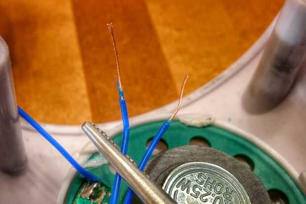 En el ejemplo usé cortadores para hacer el corte. Cables juguete suelen ser bastante delgados, así que tijeras habría sido bastante bien así. Después del corte quité parte del aislamiento azul a mano. Usé mis uñas para romper la capa y Ripeado si. Si usted mira de cerca, puede ver las marcas de corte en el insualtion. No es bonito pero funciona. Por supuesto puede usar herramientas más elegante para esto.