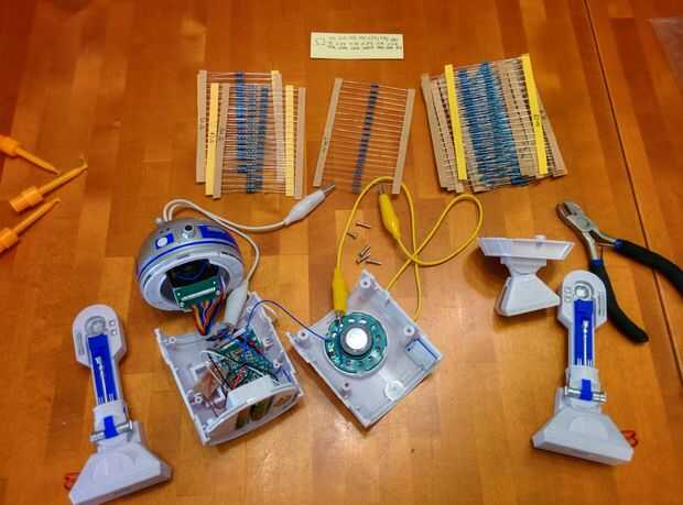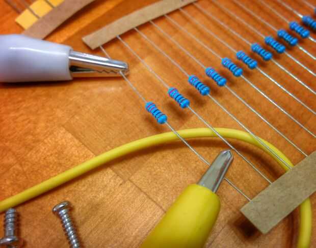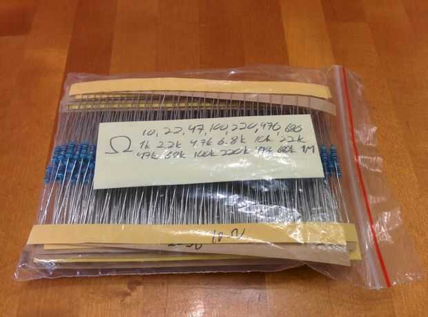Un resistor es un componente electrónico que implementa resistencia. En este caso, baja el volumen cuando se coloca en el centro del cable cortado. Resistencias tienen un valor de resistencia medido en ohmios (símbolo: Ω). cuanto mayor sea la resistencia, más baja el volumen aquí. Resistencias se pueden comprar en tiendas de electrodomesticos. El conjunto ilustrado de resistencias surtidos 400 fue US $4,58 en eBay.