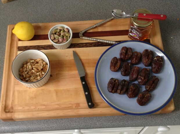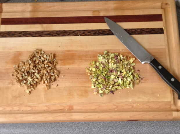 Las nueces y los pistachos de la cáscara si es necesario (usando las tuercas previamente sin cáscara hace esta receta aún más fácil!). Recomiendo utilizar pistachos tostados, salados como la sal complementa la dulzura de la miel y las fechas muy bien.