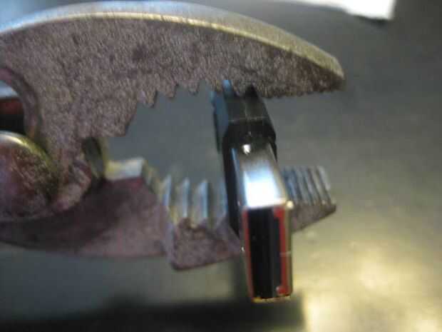 2) encontrar la costura en el cuerpo de plástico y alinee con usted los dientes de la pinza. Romper suavemente la tapa.