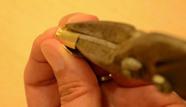 2. usando la lata de tijeras de hojalatero, corte lentamente dentro de la carcasa de la bala con un ángulo hasta que usted trabaja su manera hasta la longitud marcada. Ver el vídeo para una demostración.