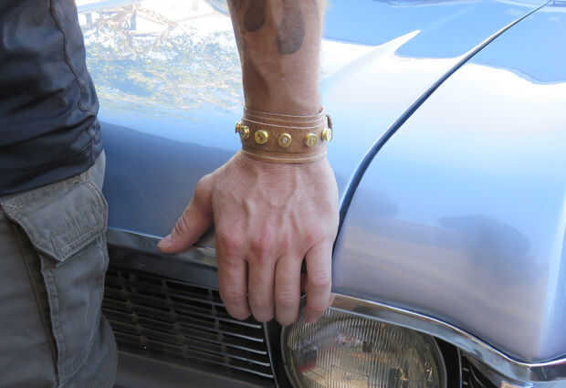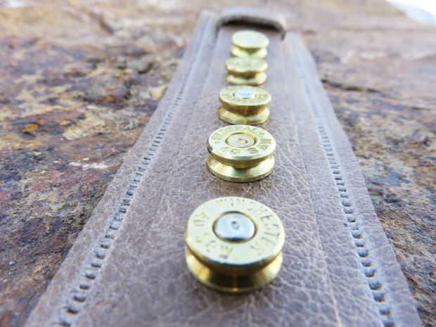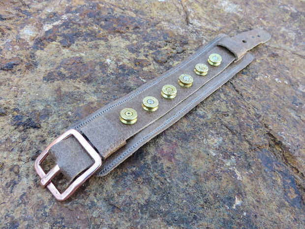 He hecho esta pulsera de alambre de cobre, cuero y conchas de bala. Utilicé herramientas normalmente para recarga de balas y también pidió prestado algunos suministros de scrapbooking de mi esposa.