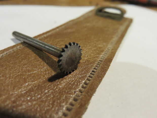 No tengo las herramientas de trabajo de cuero, así que aquí está una pequeña improvisación. Este bit pertenece en una herramienta Dremel. Puse en una sección de tubería y corría por los bordes. Para hacer una mejor impresión golpeada con un martillo de goma.