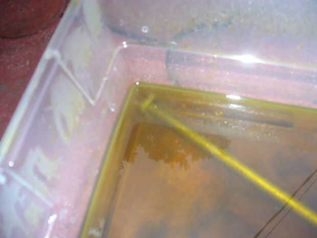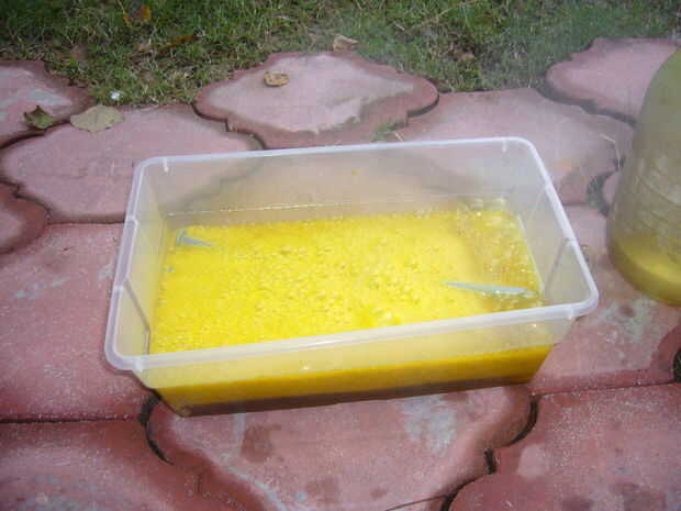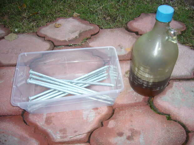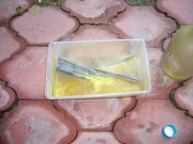 El primer paso (después de adquirir sus materiales) se pela apagado la capa galvánica (el cinc que las uñas se protegen contra la corrosión).  He utilizado un plástico "shoebox" para poner el ácido muriático en el ácido utilizado terminada siendo aproximadamente dos pulgadas de profundidad que fue suficiente para cubrir completamente todos los 11 clavos.    una vez que el ácido ha dejado de burbujear es hora de deshacerse del ácido.  Decidí echar el ácido utilizado en la botella había derramado desde (el ácido en la botella había sido utilizado varias veces antes para varias cosas).  Después el exceso de ácido se trata con enjuague las uñas excesivamente dejándolos cubiertos de agua.  (leer en la explicación) Una vez que el zinc se ha quitado de las uñas está listo para empezar a pulir.