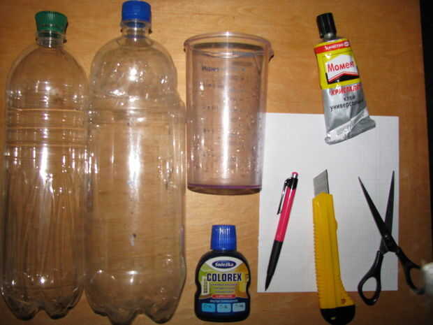Vaciar botellas de agua de 2l, 1, 5l, tijeras, hoja, lápiz, una hoja de papel, graduado tarro, colorante, cola, agua.