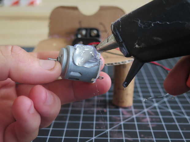 Comenzar pegando en el portabaterías. Ser muy liberal con el uso de pegamento caliente, ya que el bamboleo cualquier objeto ligeramente unido a volar. Esto es especialmente cierto cuando se encole en el motor. Añadir toneladas de pegamento caliente antes y después de pulsar en la cartulina de tu robot detrás.