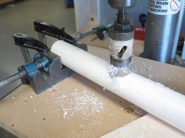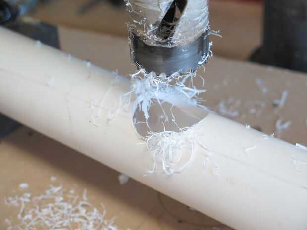 Nota: Cuando corte PVC, desea taladrar a baja velocidad y utilizar el método de "peck" de ir hacia arriba y hacia abajo para que el material fresco. Si se inicia la fusión del PVC con el taladro, está aplicando demasiada presión y volatize algunas de la maldad en PVC.