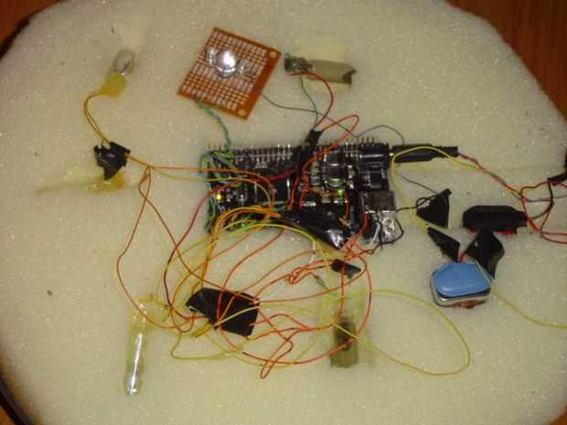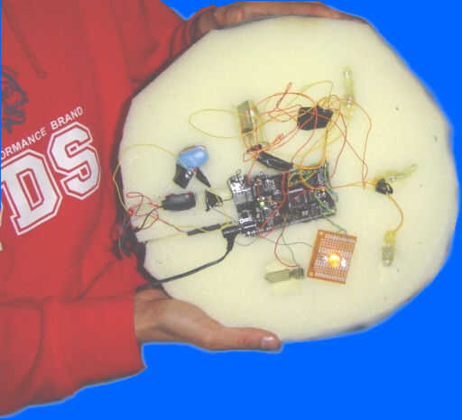 el segundo paso fue el circuito (cableado) que se presenta en el archivo. Pongo en una espuma de los contenedores de mercurio (pequeños), la batería, 4 bombillas de luz eléctrica pequeña y el circuito con el cableado. De esta manera, sólo cuando el mercurio tiene contacto con el circuito de la luz se enciende, en este caso la rueda del balanceo ha de ser vertical para encender las luces.