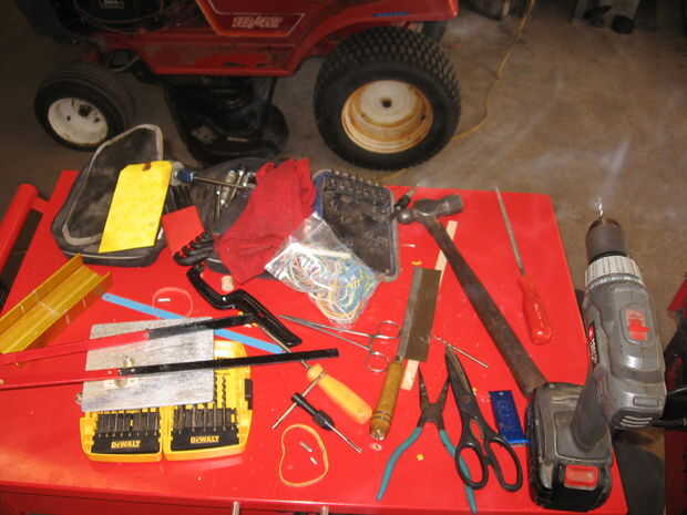 Herramientas: taladro, Sierra, llave, tijeras y una lima redonda, clavos. Con algunos otros como usted puede decir.