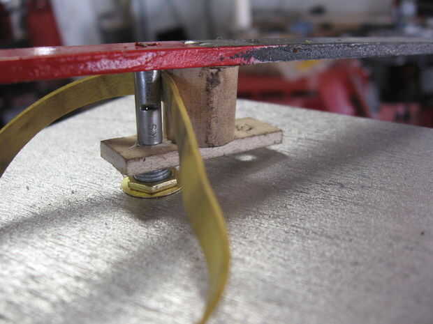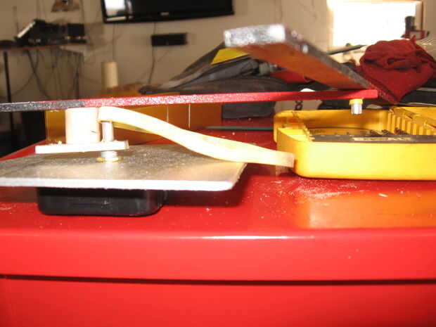 I cortar palos y espigas a la longitud, los agujeros perforados para movimiento de la mano de la hora a un pequeño trozo de palillo con taco clavado en palillo y manecilla. Utiliza conectores para mis puntos de pivote con un pedazo de uña aunque manecilla para actuar como un árbol (necesarias para mantener de una torsión debido a la goma como la correa hecha girar fuera de forma.