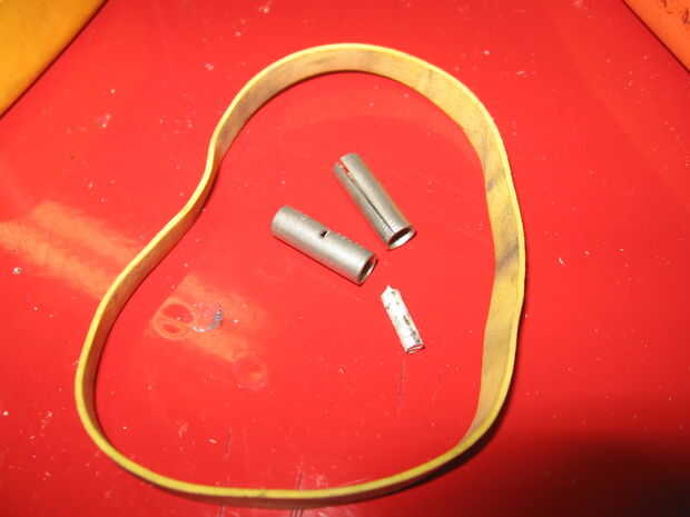 Materiales: Movimiento de reloj de cuarzo, 5 "X 6" madera placa, palos de madera de 1/2 "X 1/8" X 2', pasador de madera redonda de 1/2" X5/8" conectores largos y sin aislamiento, banda de goma.