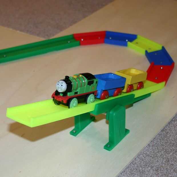 Un tren de "tipo Brio" motorizado sube este balancín--y su peso lo voltea por el otro lado.  La pista (en realidad es un canal) es impreso en 3D y puede ser personalizada en cuanto a ángulo, radio, longitud y color.