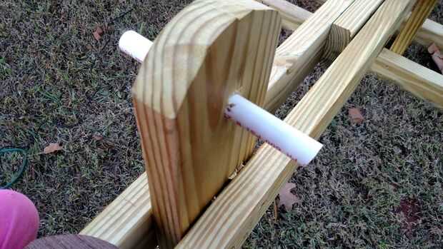 Tomar estas secciones y lugar entre el final de sus 2x4s y dejar espacio para el asiento (dejé unos 12" desde los extremos).