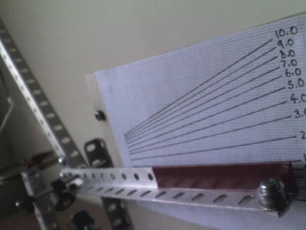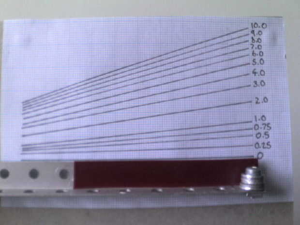 para hacer la escala en su papel de gráfico es útil para saber que la chincheta promedio pesa 0,25 gramos y averiguar cuánto pesan tus monedas de los países. Por suerte aquí en Nueva Zelanda la nueva serie de monedas han acaba de salir, y son de un tamaño práctico. 10 céntimos pesa 3.3 g, 20 céntimos pesa 4 g y el weighs5g de 50 cent. Con estos pesos conocidos elabore su escala colocando pesos conocidos en la bandeja en su escala, marca el intervalo de su papel de gráfico y seguir haciendo esto con más pesos. Usé monedas así como las chinchetas para verificar ya que pesan la misma cantidad y asegúrese de que la escala sea correcta. Una vez que ha marcado todos los intervalos en el papel milimetrado que se acaba el juego de escalas. mina fue muy sensible para arriba a un gramo y luego el intervalo disminuido rápidamente hasta que los imanes tocaron, justo después de 10g.