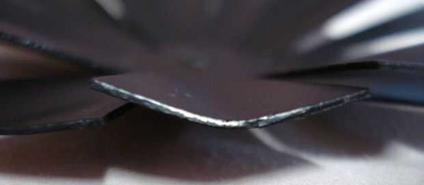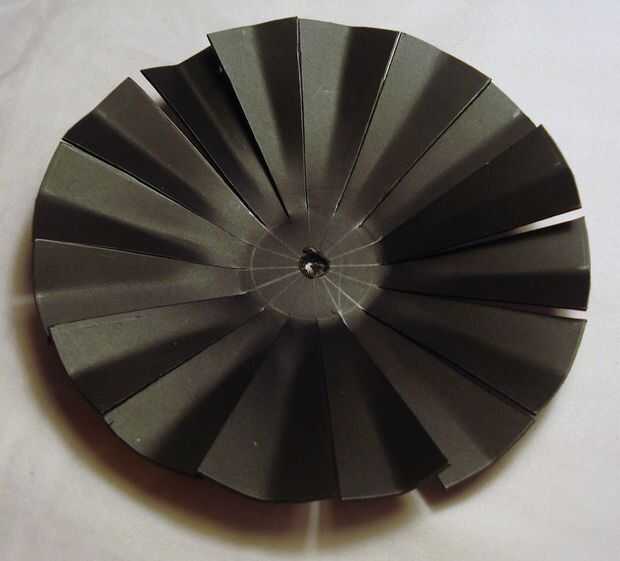 centímetro (el radio es la distancia desde el centro del círculo hasta el borde del círculo). Cuando termines tu círculo debería verse como la foto 3. Luego corte a lo largo de la línea que dibujó pero no corte hasta el tope central en el círculo pequeño que dibujó anteriormente. Ahora con el borde de una mesa o una puerta, doble la cola como en los cuadros 4-6. Perfore un orificio en el centro de ustedes de ahora la cola como en el cuadro 6, tendrá que montar sobre el perno en la bala.