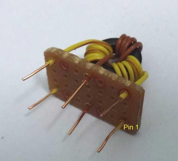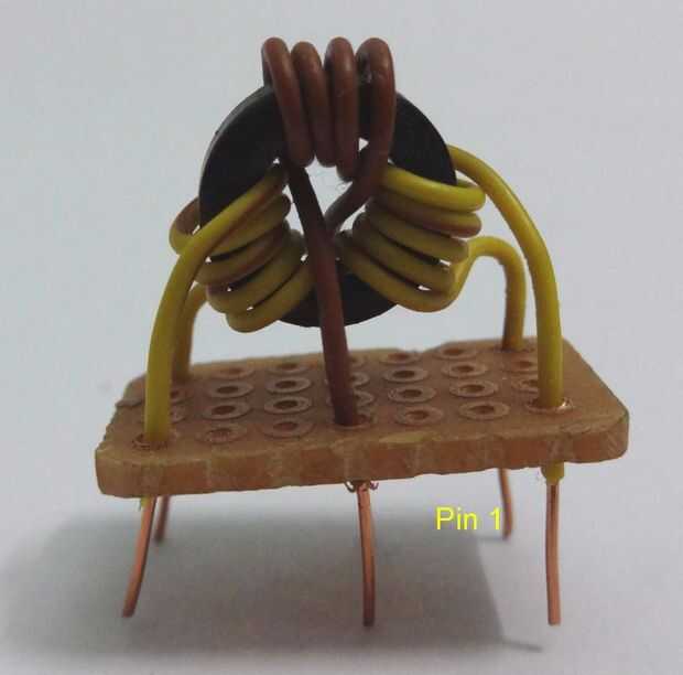 Este transformador toroide proporciona la unidad a los transistores Q1 y Q2 en la fase correcta y la amplitud para crear un sistema de retroalimentación positiva que oscila en la frecuencia resonante. El transformador se enrolla con alambre aislado solo-filamento primario de 4 vueltas y dos secundarias de 5 vueltas cada uno. El toroide es un núcleo de ferrita de Mahindra-Hinoday con número de parte T 10 X 3 y material MSB5S. La dirección de la bobina debe ser exactamente como se muestra en las imágenes.