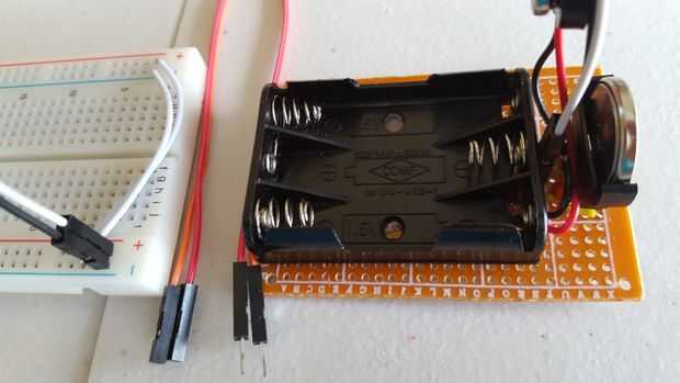 Al crear nuevas creaciones en mi protoboard, me cansé de buscar los conectores de la batería y a veces se me olvida pedirlos, y tengo que esperar hasta que llegan. Así, simplemente tomé un prototipo board y están montadas en mi tres más usan acumuladores: botón de 3V, 3-AAA y 9V. Conecto a un conjunto de pines macho y entonces usan un conector macho-hembra para conectar en el protoboard.