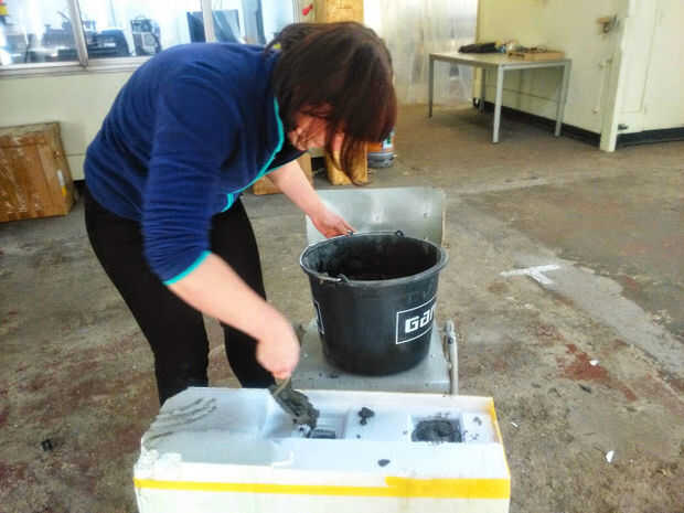 Cinta del molde negativo que sólo se cortan para que no se abre debido al peso del concreto. Una vez asegurado llenar el molde con una mezcla preparada de antemano de hormigón y tap en todos los lados para dejar escapar aire.