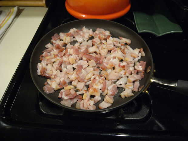 1. Comience dorar la panceta en una sartén sobre fuego medio alto. Aceite no es necesario, como la grasa se extinguirían rápidamente. No quiero el tocino para llegar a la etapa de crujiente, sólo ligeramente dorada (ver foto).