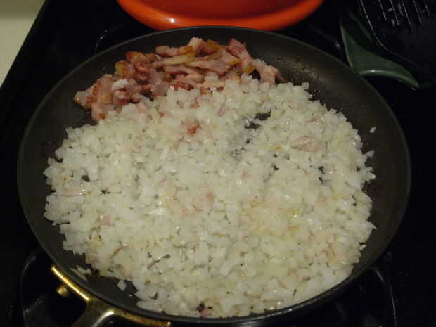 3. Empuje el tocino restante al lado de la sartén y añadir la cebolla. Cocinar las cebollas hasta que doren también.