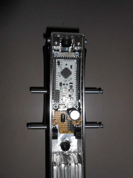 Como veis en la foto también he añadido un circuito de distribución de energía casera simple para los servos... Te recomiendo que uses condensadores cerámicos y electrolíticos para mantener los picos eléctricos generados por los servos bajo control...