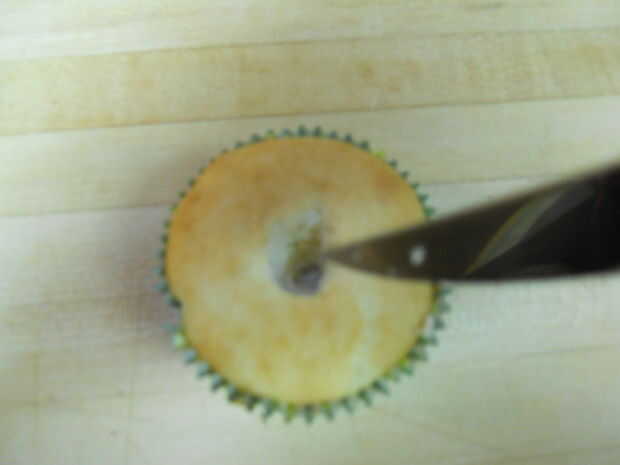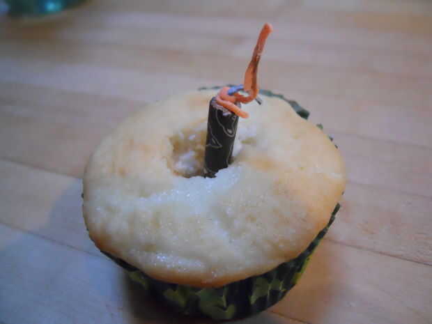 Deje que los cupcakes se enfríe durante unos 10 minutos (5 Si eres impaciente). Luego con un pequeño agujero en el Magdalena y presione hacia abajo para que el pastel va a la parte inferior. Coloque el petardo en el orificio. Probablemente usted necesitará experimentar con formas de empacar el confeti alrededor de los fuegos artificiales. Hará la diferencia entre bits de confeti disparando en el aire y la total aniquilación de la Magdalena. ¡Buena suerte!