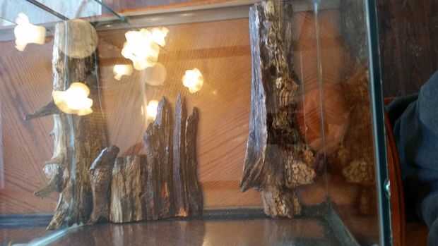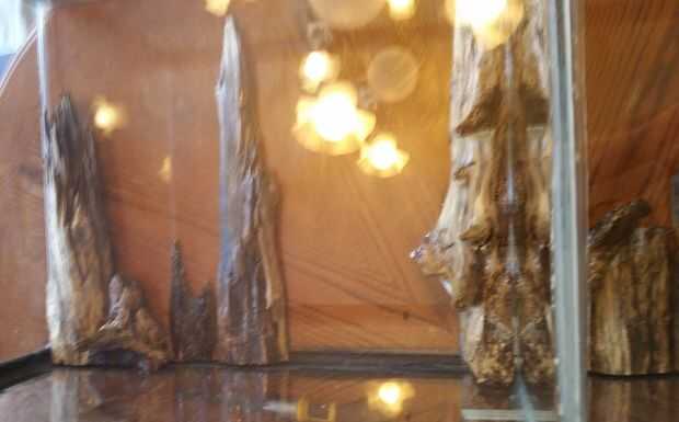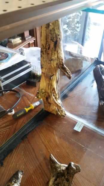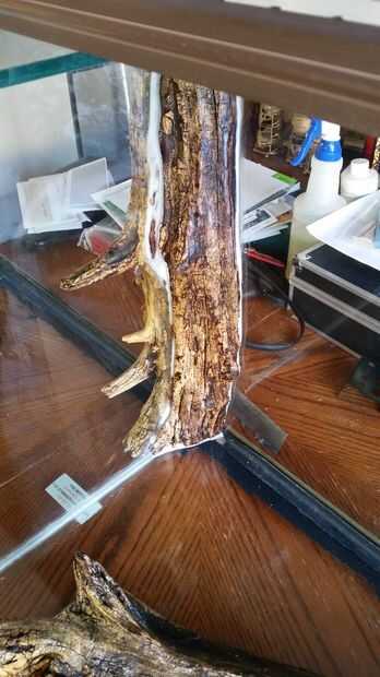 Este paso implicó un poco de toque artístico. Gracias a Dios mi hija estaba ahí para echar una mano. Así que básicamente tenía varias piezas de la madera de deriva en cuartos/tratados. Tomar el tiempo para "jigsaw" estas piezas en diferentes lugares en el tanque. Mirarlos desde diferentes ángulos. Esto le ayudará para que coloque justo donde usted quiere. Usé la misma silicona para adherir a la madera a la pared del tanque. Una vez más deje que se cure.