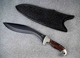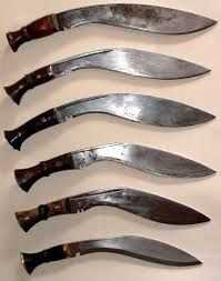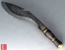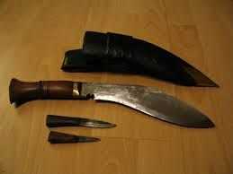 La hoja tiene una curva en el frente así como masa adicional para un peso más pesado. Otro punto interesante en la construcción de un kukri típico es las muescas en la hoja, similar a un choil. Sin embargo dicen detiene la sangre gotee sobre los de la mano. Esto protege una vez agarre y aumenta la longevidad de la manija. El cuchillo también tiene dos otros cuchillos pequeños asociados. Están en la envoltura o en un caso separado. Se les llama Karda y Chakmak. El Karda es una hoja pequeña utilidad y thr Chakmak es una hoja para el afilado.
