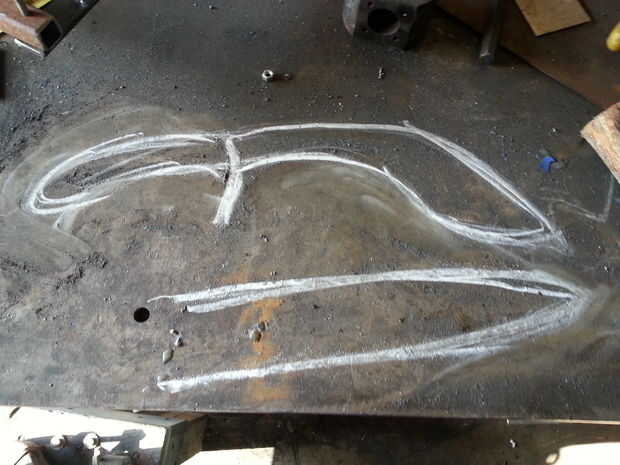 Para este machete empecé con alrededor de una sección de 18 pulgadas. Corte los orificios y comenzó la forja. Luego marca la dimensión de la pieza sobre la mesa y dibujó una meta final para hacer referencia a.